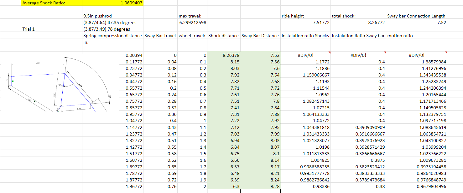Well, that’s easy right? like I said, in theory. The real “issues” come from optimizing the ratio between the articulation of the wheel travel (vertically) and the compression of the spring. Our goal was to have a 1:1 ratio. As shown to the right, this is the sketch that I created of all the suspension components and how they interact. Since the entire system is dynamic, the ratio changes throughout the cyclic motion of the suspension travel. After many (hundreds) of iterations of all the different variables at play, I came to a final design. Thanks to my partner throughout this process, Ethan Smith, for creating an Excel spreadsheet to to these calculations for me.